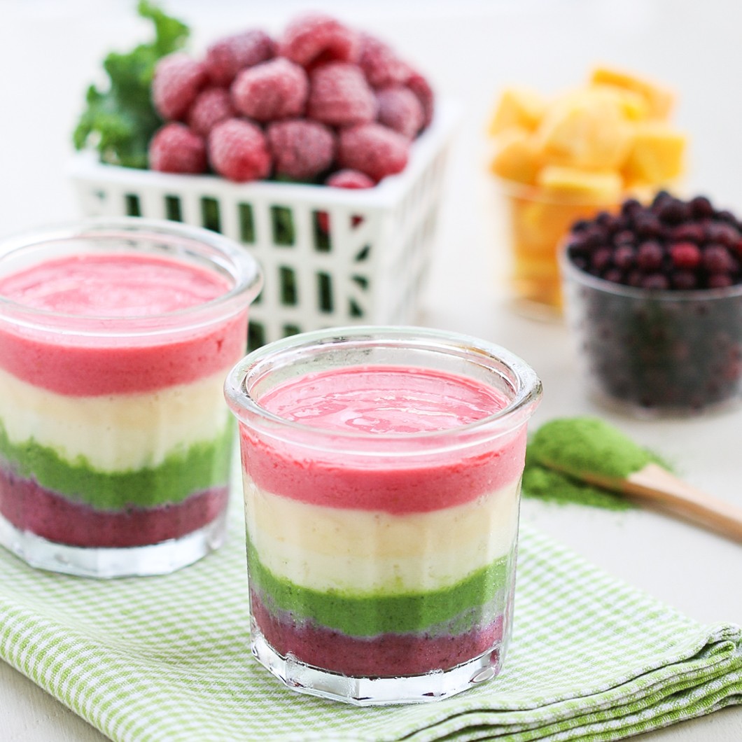 Потребни ти се 100 г сечкани јагоди, 2 излупени исечкани киви, 1 излупена и исечкана банана и неколку гоџи бобинки. Секое овошје изблендирај го одделно, со тоа што гоџи бобинките ќе ги изблендираш заедно со бананата. Избери убава висока чаша и изблендираните овошја додавај ги едно по едно .