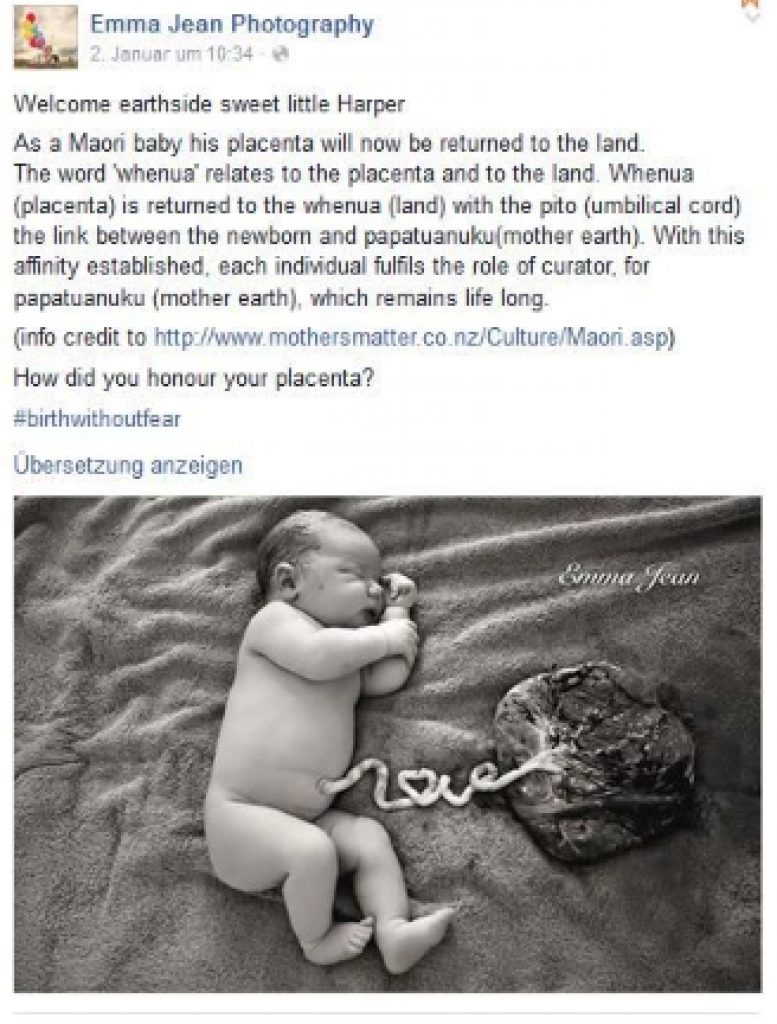 Фотографијата на малата Харпер Хоани е направена во Австралија од фотографката и поранешна акушерка Ема Џин Нолан само час и половина по нејзиното раѓање. Под фотографијата објавена на Фејсбук, Ема објасни дека папочната врвца и плацентата се од посебна вредност и важност за Маорите. Затоа се закопани во земја како знак на односот на детето со мајката Земја, од каде што потекнува, и со неговите предци.