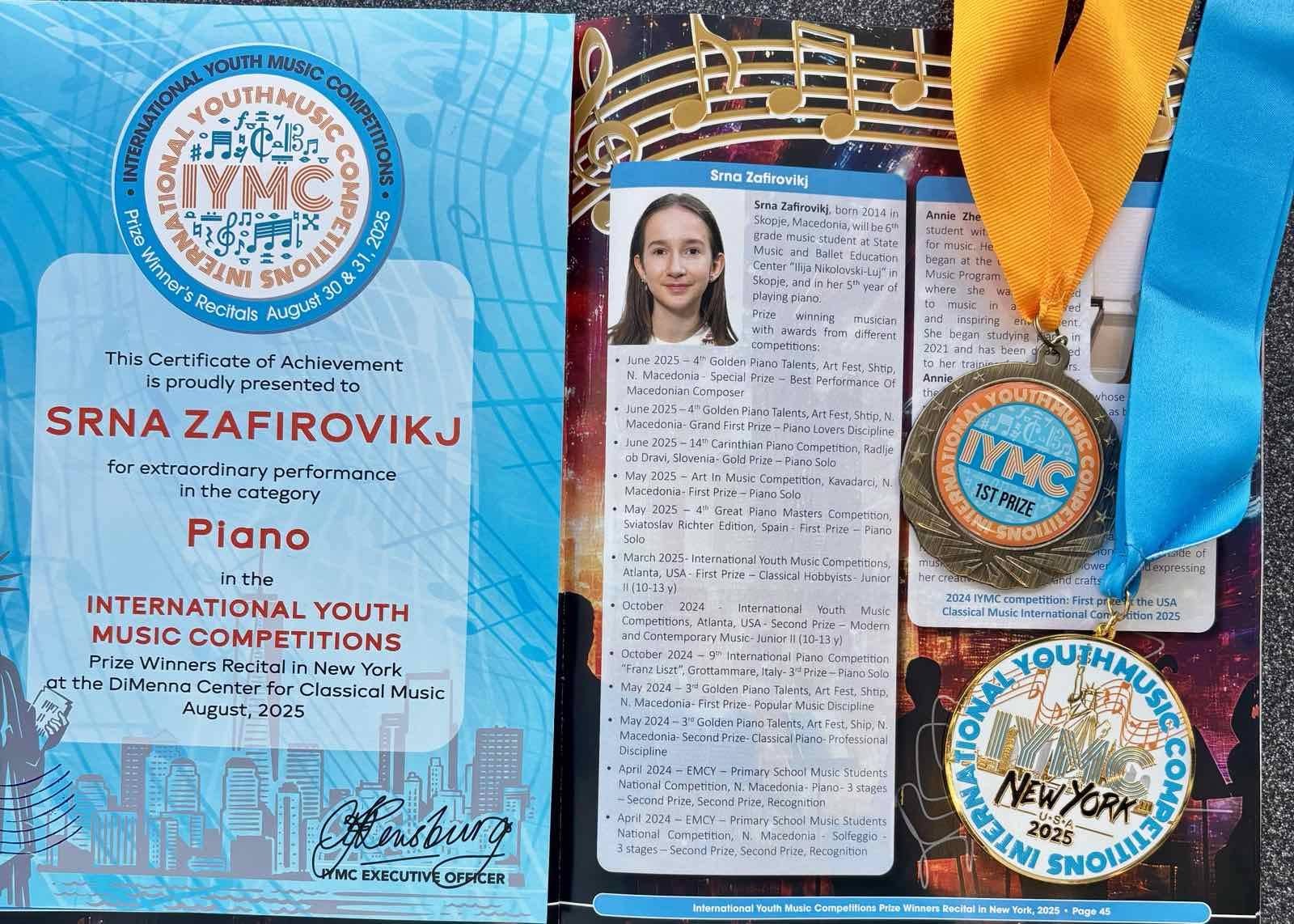 Срна Зафировиќ и Теодор Прошев, како добитници на прва награда, настапија во преполната сала на музичкиот центар „Di Menna“ во срцето на Менхетн, во Њујорк каде беа одржани концертите на победниците од натпреварите по музика организирани од IYMC – International Youth Music Competitions на кои се претставија најдобрите млади музички таленти од целиот свет.